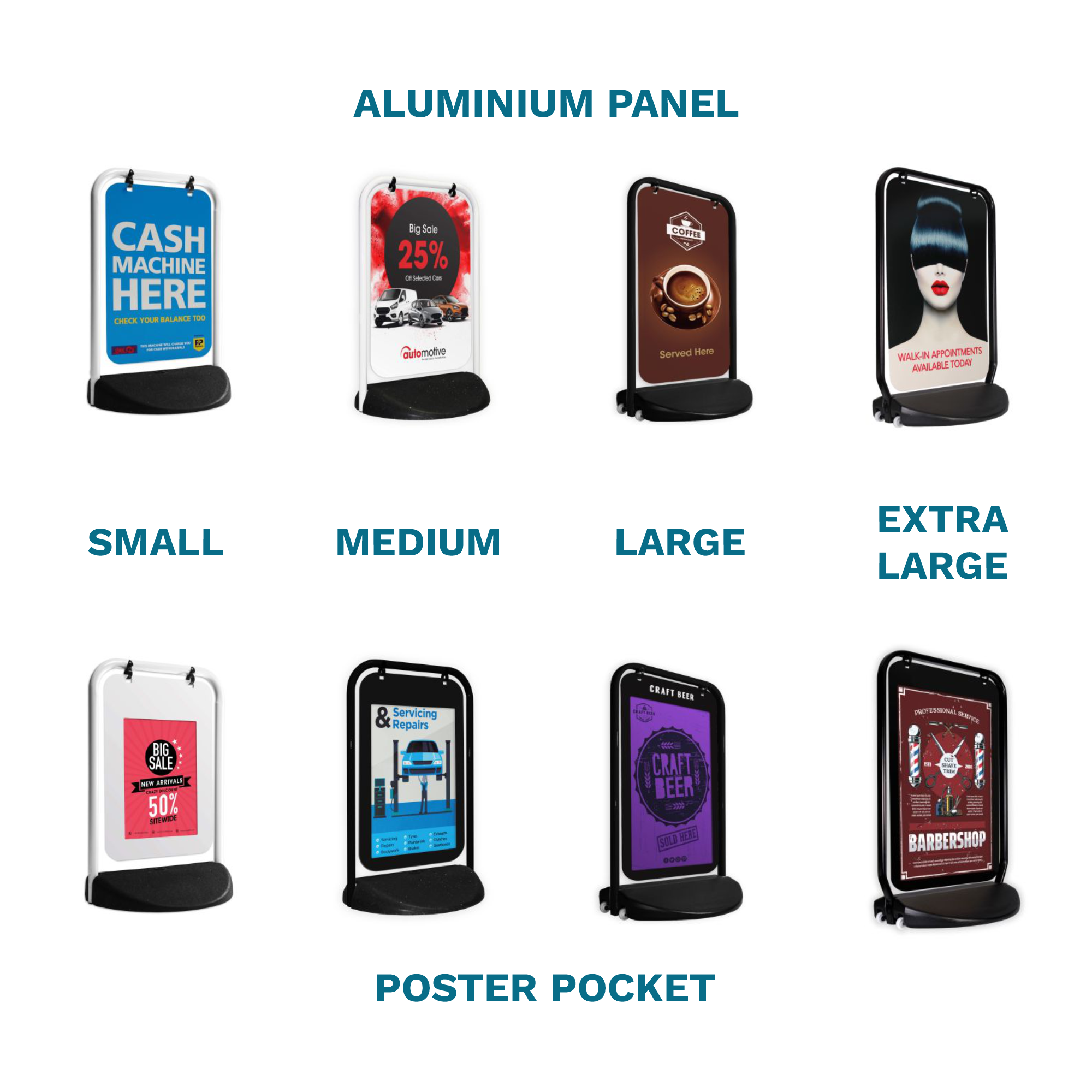 Comes complete with an aluminium panel or a poster pocket with 2 printed posters. The frame is made from steel and has a recycled PVC base. Available in a range of sizes and black or white frame, whichever suits you and your brand the best!